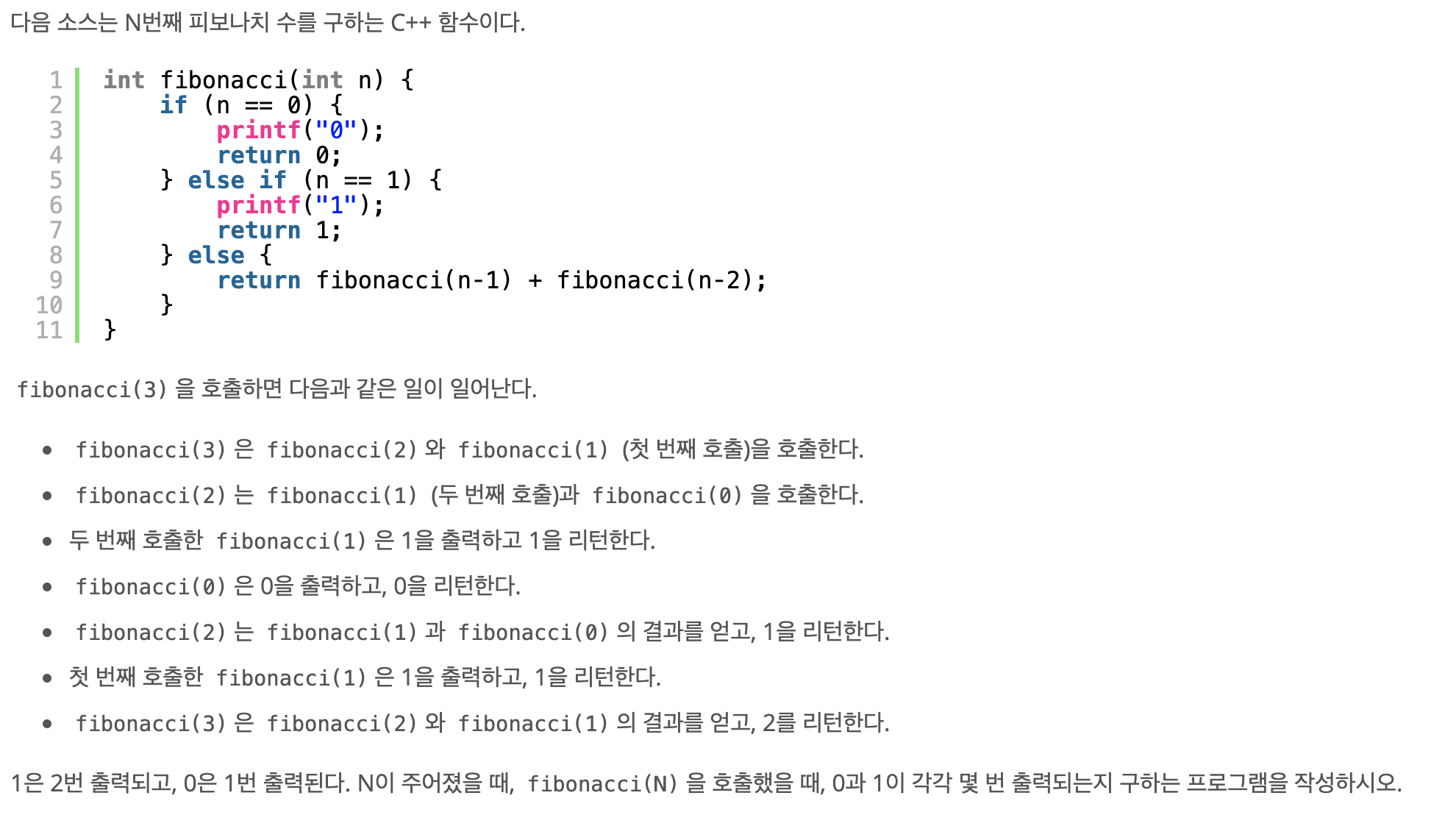 1003번 문제에는 피보나치 함수가 소개되어 있고, 문제에 대한 설명을 아래와 같이 해두었습니다.