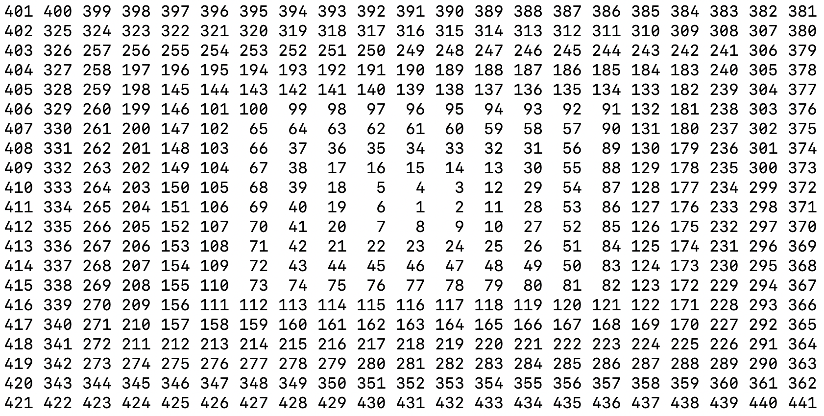 먼저 소용돌이는 문제에서 알려준 것처럼 중앙에서 출발해 숫자를 늘리며 나선형으로 배열되어 만들어집니다. 이해하는데 크게 어렵지는 않으나, 제 풀이에는 이 소용돌이를 어떻게 바라보느냐가 중요합니다. 행 번호는 r로, 열 번호는 c로 표현할 때, 아래는 -10 < r < 10, -10 < c < 10 까지 출력한 소용돌이의 모습입니다.