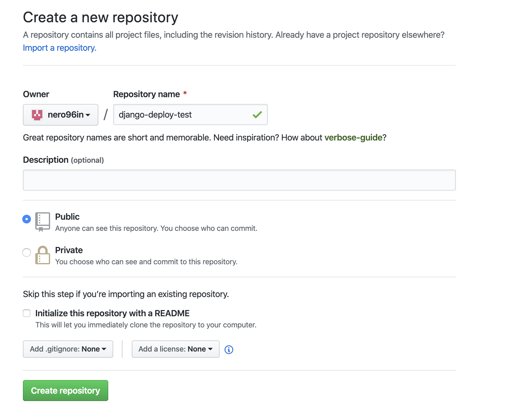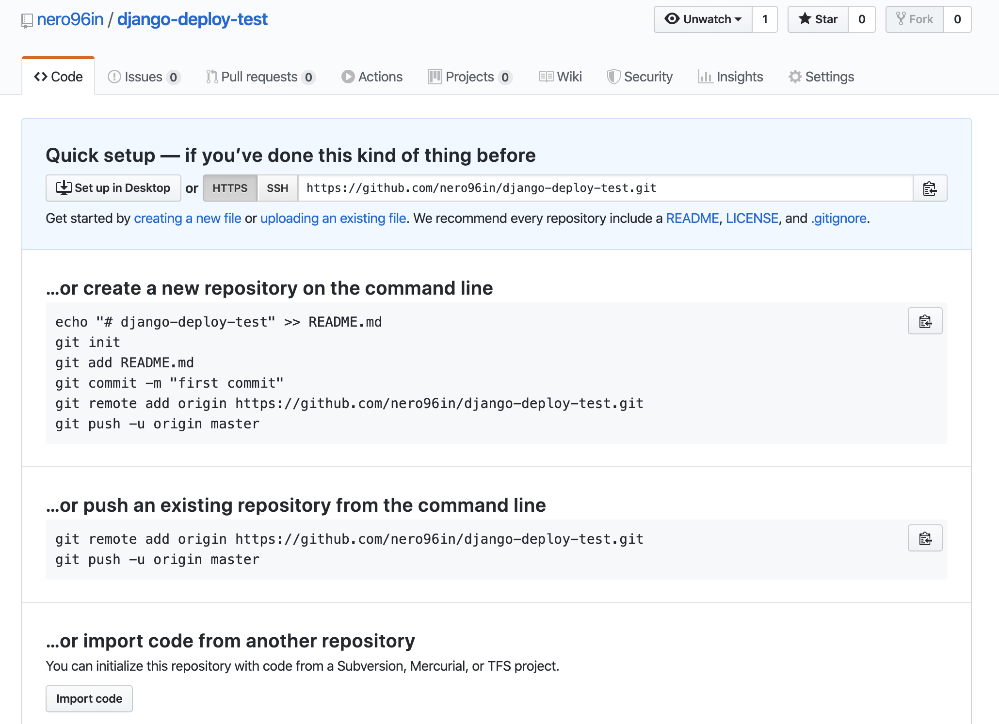 레포지토리 주소는 위 안내 화면에서 git remote add origin 뒤의 주소를 입력하시면 됩니다. 즉, 저의 경우엔 https://github.com/nero96in/django-deploy-test.git 것이죠.