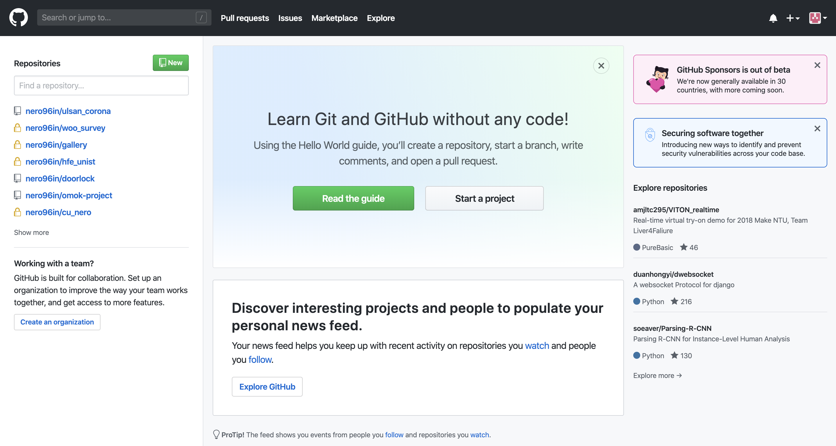 먼저, github 계정으로 로그인한 뒤 보이는 start a project를 누르시거나 좌측 repository 메뉴에서 new를 클릭해주세요.