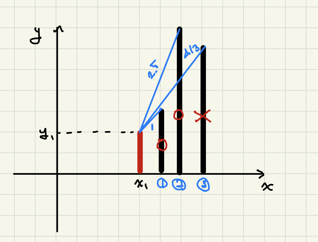 우선, 빨간색 건물을 기준으로 본다고 할 때, 저는 이 건물의 오른쪽에서 가장 가까운 건물을 순서대로 이 건물을 볼 수 있는 것인지 살펴볼 것입니다. 즉, X축에 표시된 1, 2, 3번 건물을 순서대로 탐색을 할건데, 이 때 두 건물의 지붕을 잇는 선분의 기울기에 집중하려고 합니다. 먼저, 빨간색 건물과 1번 건물을 보면 두 지붕을 잇는 선분의 기울기는 1입니다. 가장 가까운 건물이니까 이 건물은 당연히 볼 수 있는 건물이 되겠죠? 다음, 2번 건물과의 지붕 사이 기울기는 2.5입니다. 즉, 2번 건물은 볼 수 있습니다. 그 이유는 2번 건물의 지붕과 잇는 선분의 기울기가 앞에 있는 1번 건물과 잇는 선분의 기울기보다 크기 때문에 빨간 건물에서 2번 건물을 보기 위한 각도가 나오기 때문입니다. 하지만, 3번 건물은 볼 수 없습니다. 그 이유는 단순히 2번 건물보다 높이가 낮기 때문이 아니고 애초에 빨간 건물에서 3번 건물의 지붕과 잇는 선분의 기울기가 앞의 2번 건물과의 기울기보다 작기 때문에 볼 수 있는 각도가 안나오기 때문입니다.