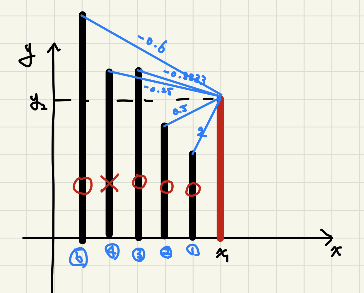 빨간 건물의 왼쪽에서 볼 수 있는 건물을 세려면 어떻게 해야 할까요? 왼쪽에서 볼 수 있는 건물은 오른쪽에서 볼 수 있는 건물의 조건과 반대로 앞서 나온 기울기의 최소보다 기울기가 작아지면 볼 수가 있습니다. 이 부분은 위에서 설명한 오른쪽에서 볼 수 있는 건물들과 설명이 비슷하기 때문에 아래의 그림만 첨부해드리고 넘어갈게요! 스스로 생각해 보시기에 충분합니다. 4번 건물의 -0.25의 기울기는 3번 건물에서 -0.3333이라는 더 작은 기울기가 나왔기 때문에 볼 수 없는 건물이 되어요.
